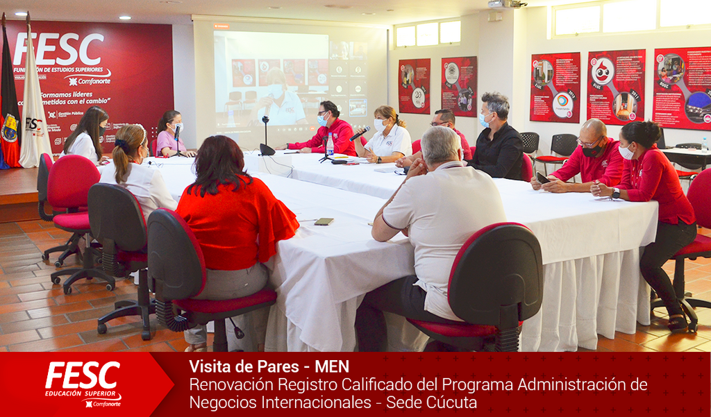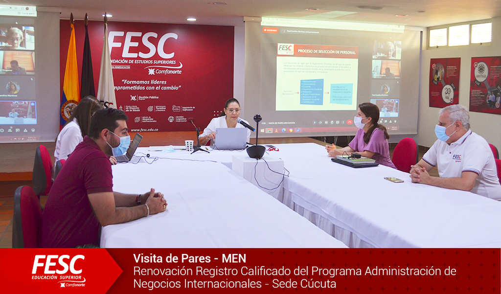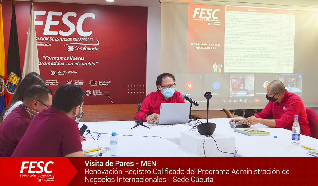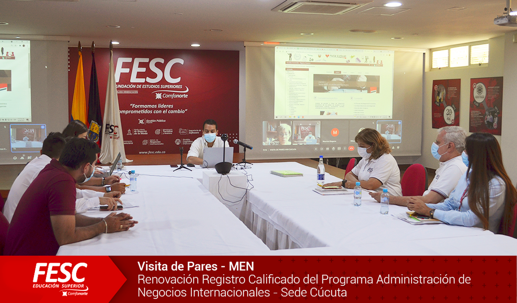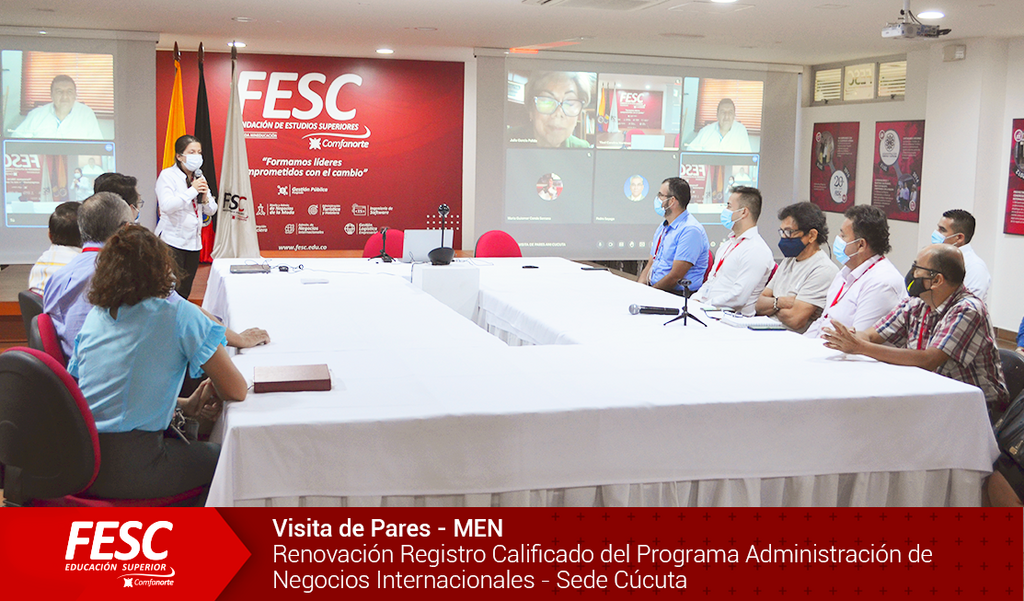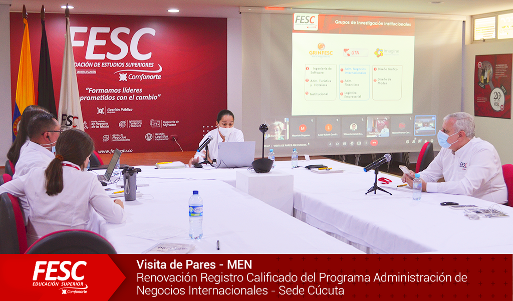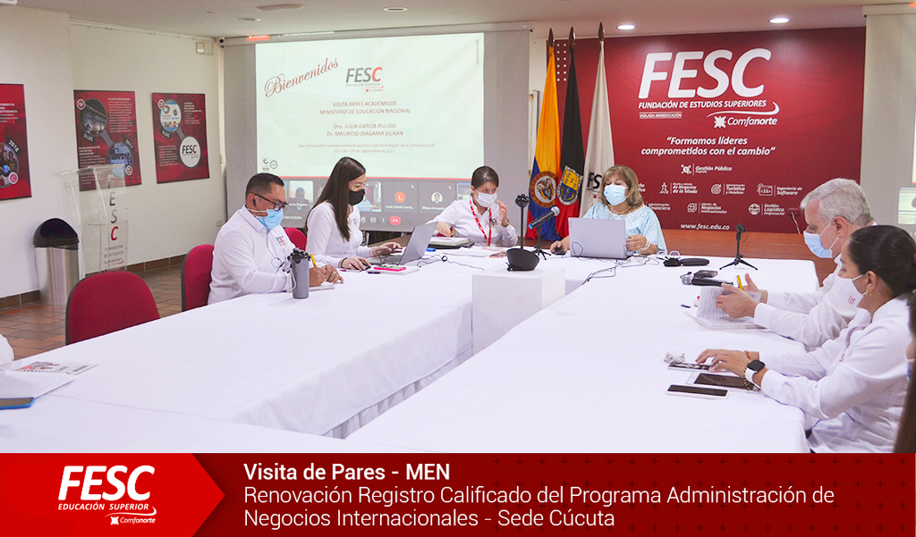 El pasado 23 y 24 de septiembre, la FESC atendió la visita de verificación de condiciones de calidad del programa Administración de Negocios Internacionales objeto de renovación, realizada por los pares académicos, doctora Julia García Pulido y el doctor Mauricio Diagama, delegados por el Ministerio de Educación Nacional en la ciudad de Cúcuta.