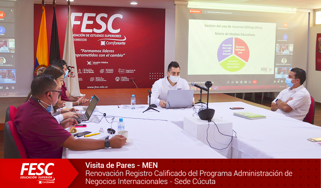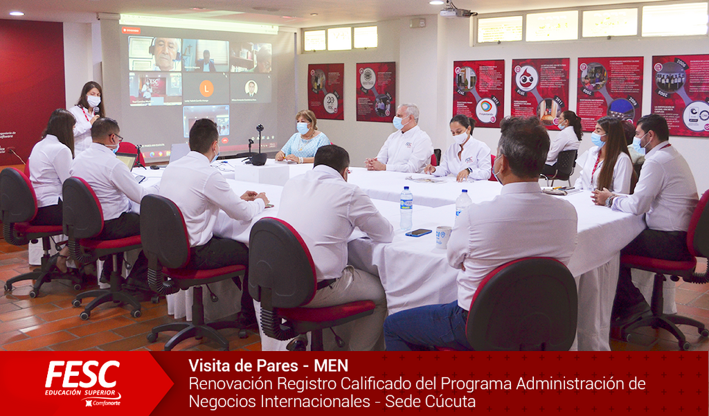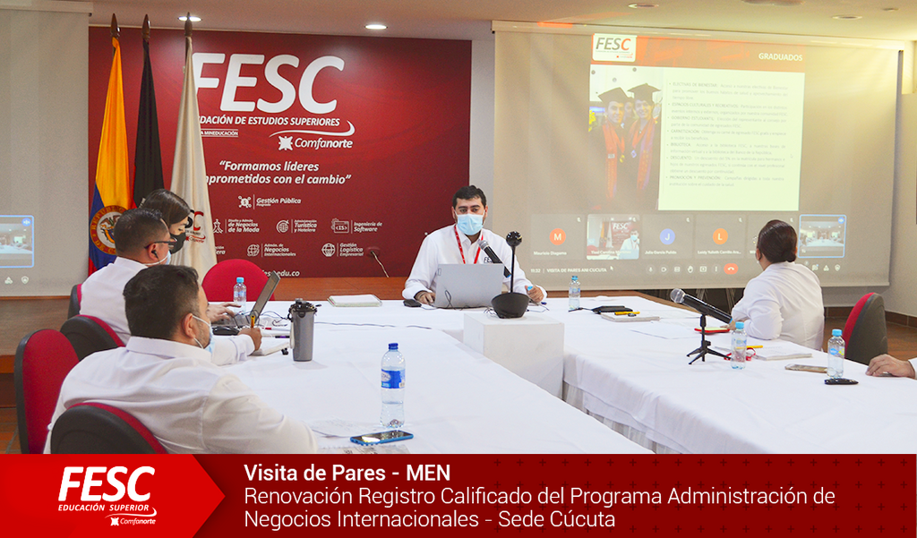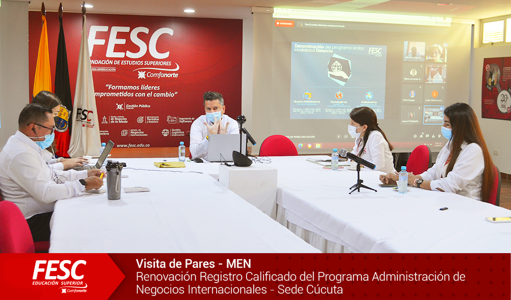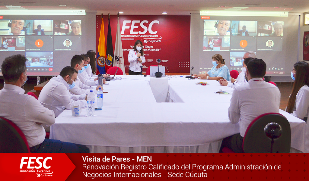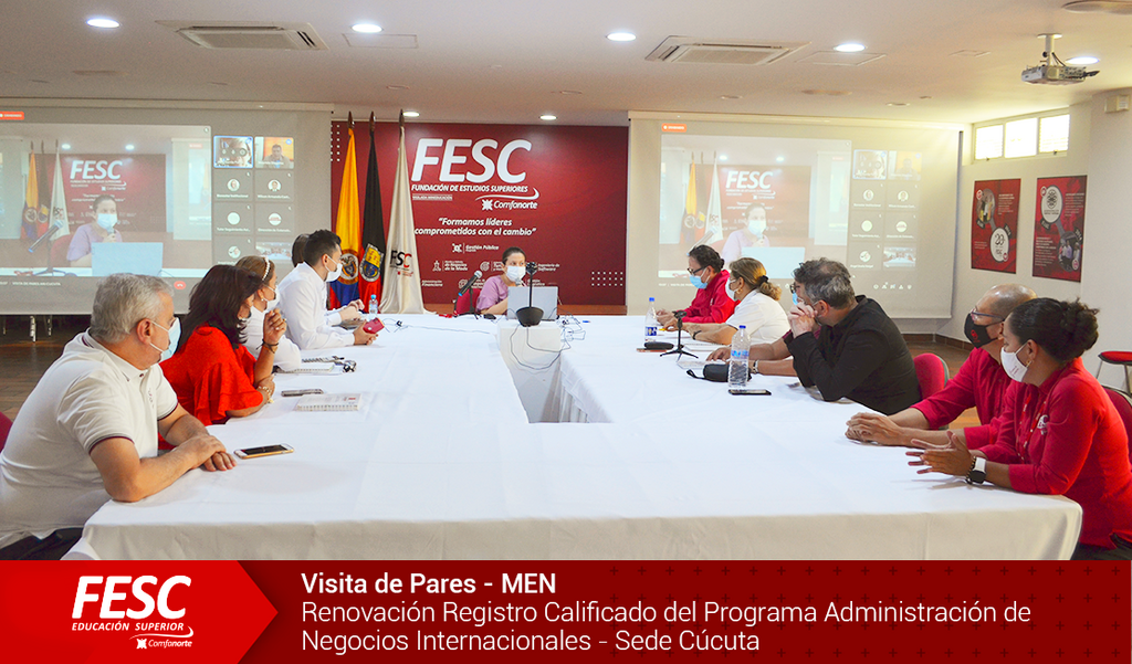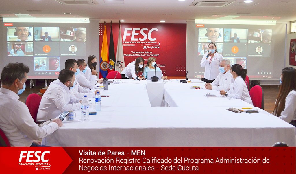 El pasado 23 y 24 de septiembre, la FESC atendió la visita de verificación de condiciones de calidad del programa Administración de Negocios Internacionales objeto de renovación, realizada por los pares académicos, doctora Julia García Pulido y el doctor Mauricio Diagama, delegados por el Ministerio de Educación Nacional en la ciudad de Cúcuta.