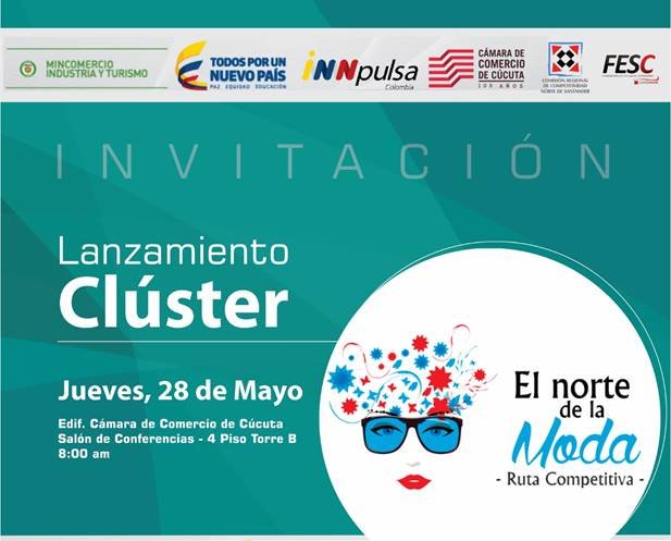 La Cámara de Comercio de Cúcuta y la FESC tiene el gusto de invitarlo al lanzamiento oficial del Cluster “el norte de la moda” este jueves 28 de mayo a las 8:00 horas en el salón de Conferencias ,4 piso, torre B en el edificio Cámara de Comercio Cúcuta.