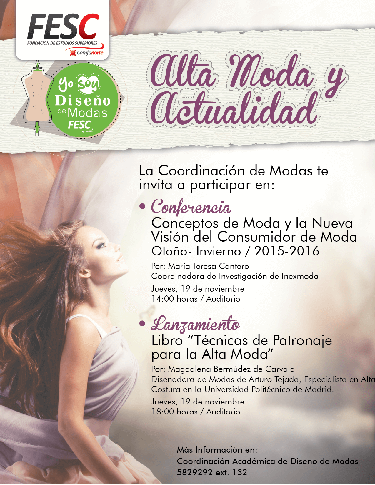 A partir de las 2:00 de la tarde el auditorio Eduardo Assaf Elcure será testigo de varios eventos de alta moda donde se involucrarán grandes diseñadoras de nuestro país, una de ellas es María Teresa Cantero, quien tiene una maestría en Estética de la Universidad Nacional de Colombia, es actualmente la Coordinadora de investigación del Laboratorio de Moda Indexmoda y participó como conferencista en el II Congreso Internacional Proyectado de nuestra Institución, ella será quien dictará una conferencia sobre los nuevos conceptos de moda Otoño- invierno/ 2015- 2016 y la nueva visión del consumidor, dos temas realmente interesantes que estamos seguros que los que viven en el mundo de la moda no se lo perderán, por otro lado, cayendo la noche a eso de las 6:00 pm tendremos a la diseñadora de modas Magdalena Bermúdez de Carvajal egresada de la universidad Arturo Tejada Cano de Bogotá , con especialización en alta costura en la Universidad Politécnico de Madrid (España), y reconocida por sus asesorías en patronaje e interpretación de moda en las casas de moda Pepa Pombo y Hernán Zajar , quien nos hará testigos del lanzamiento de su libro “Técnicas de Patronaje Para La Alta Moda” un libro que ilustrara a todos nuestros próximos profesionales del mundo de la moda.