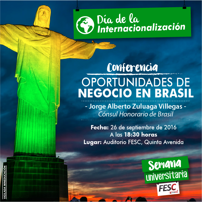 El objeto de su visita es presentar Oportunidades de Exportación hacia Brasil, para empresas de diferentes sectores económicos del departamento, basado en un estudio de investigación, para lo cual orientará la conferencia “Oportunidades de Negocio en Brasil” el día lunes a las 18:30 horas, en el auditorio FESC Quinta avenida.