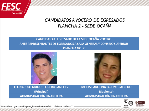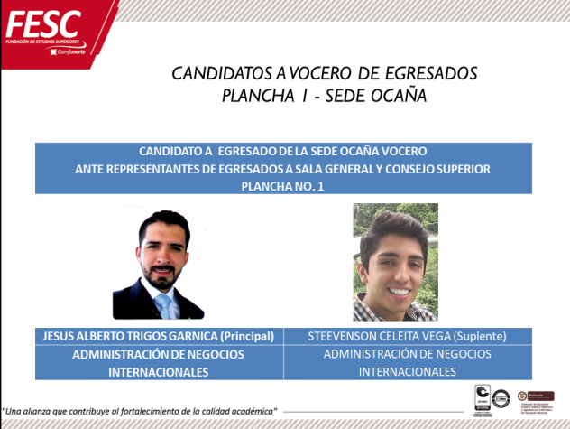 El evento contó con la asistencia de un total de 34 egresados, entre ellos los candidatos a Vocero de Egresados de la sede, acompañado de la coordinación de la Sede Ocaña y como invitada especial la Dra. Carmen Cecilia Quero de González - Rectora FESC acompañada de los Coordinadores de los Programas Académicos, el cual se aprovechópara realizar la presentación de los candidatos, su propuesta y finalmente la elección, quedando Vocero principal de los Egresados la plancha No.1 JESÚS ALBERTO TRIGOS GARNICA y como suplente STEVENSON CELEITA VEGA, juntos del programa ADMINISTRACIÓN DE NEGOCIOS INTERNACIONALES, con un total de 23 votos frente a 11 votos de la plancha No. 2.