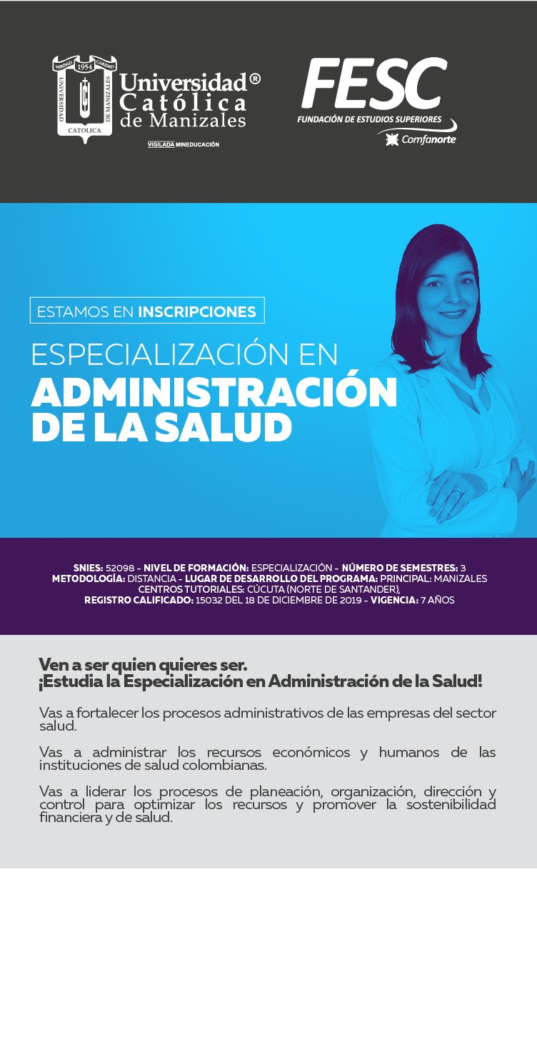 Mediante convenio de colaboración interinstitucional NO. 001- 2012- 01-2 suscrito entre la universidad Católica de Manizales y la Fundación de Estudios Superiores Comfanorte FESC, la Hermana rectora Gloria del Carmen Torres Bustamante, representante legal de la UCM y Carmen Cecilia Quero de González, representante legal de la FESC celebraron el convenio el cual permite ofrecer la especialización en administración de la salud.